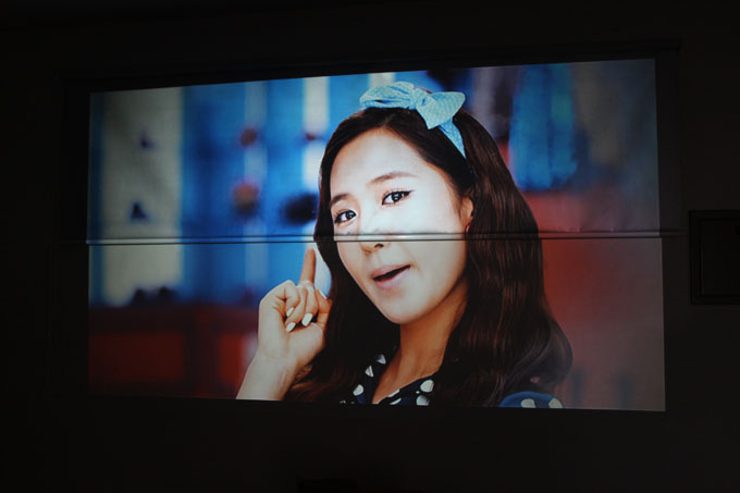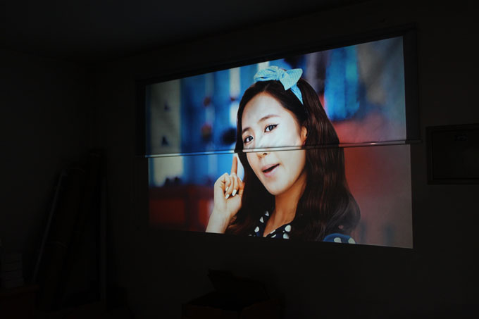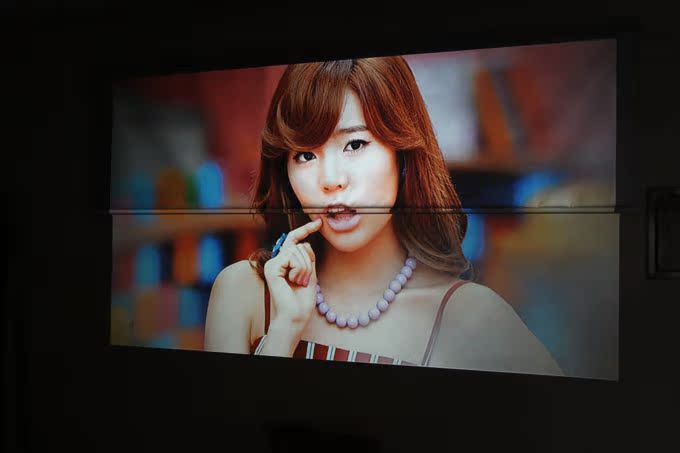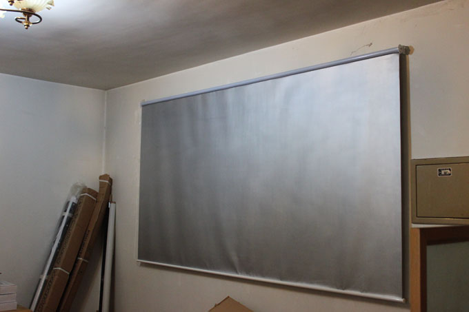 我们首先测试一下幕布常规的增益性能,下方的几个图片,都是幕布拉起来一半,上面为金属幕,下面为普通的白墙,可以看到采用金属幕,显色显得鲜艳一些,当然,亮度也有增加。